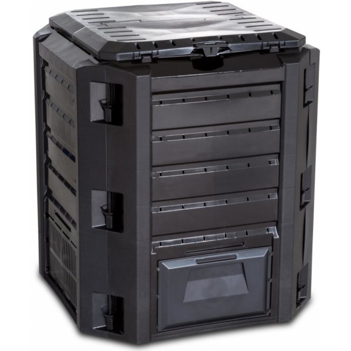 Kompostér Compogreen, vyrobený z modifikovaného polypropylenu, má do detailů promyšlenou konstrukci - je uzavřený, takže zabraňuje vniku zvířat; zároveň však nemá dno kvůli volnému styku s půdou a je opatřen provzdušňovacími otvory, díky nimž bude rozpad bioodpadu rychlejší. Opomenout nelze ani praktická dvířka usnadňující přístup k hotovému kompostu.